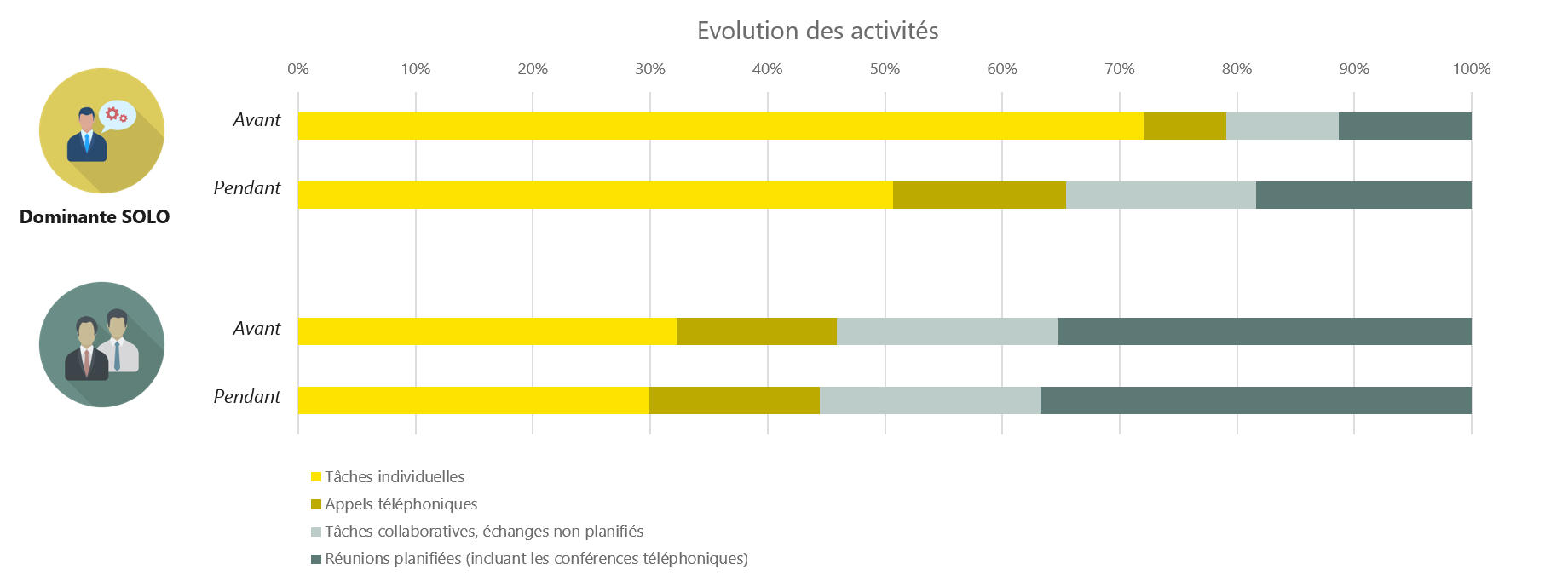 Nicht alle Mitarbeiter haben also die gleichen Bedürfnisse, wenn sie ins Büro zurückkehren. Die Schlussfolgerungen, die in Bezug auf den informellen Austausch gezogen wurden, erinnern an die von Franck Duffy in den 1990er Jahren. Er erstellte verschiedene Profile, die sich nach dem Grad der Autonomie und dem Bedürfnis nach Interaktion richten. Für weniger autonome Profile, die von Prozessen geprägt sind (Verwaltungsprofile) oder besonders eng verflochtene Aufgaben haben (Beispiel: Konstruktionsbüro), empfiehlt er Umgebungen mit gemeinsam genutzten Räumen. Für Arbeitnehmer, die am autonomsten sind und Interaktionen benötigen, wie z. B. Projektmanager, empfiehlt er eine aktivitätsbasierte Umgebung. Für diejenigen, die selbstständig sind und mehr allein arbeiten, empfiehlt er geschlossene Einzelräume.