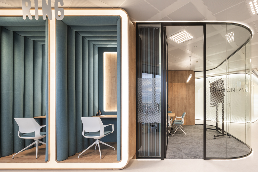 The materials selected play a crucial role in shaping this inspiring atmosphere. The abundant entry of natural light, filtered through organic forms and open spaces, encourages human connection. Meeting rooms and booths, designed with flowing lines, not only offer privacy when needed, but also encourage interaction and the exchange of ideas.