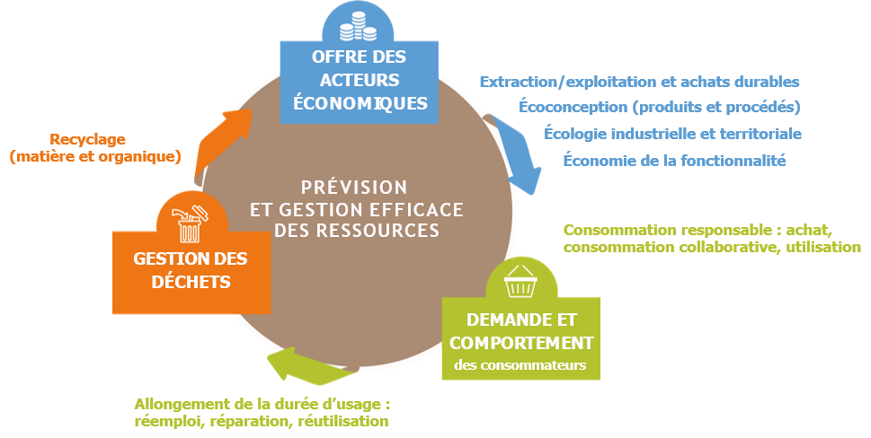 Les domaines et les piliers de l’économie circulaire. Adapté de « L’économie circulaire. 3 domaines, 7 piliers », par l’ADEME