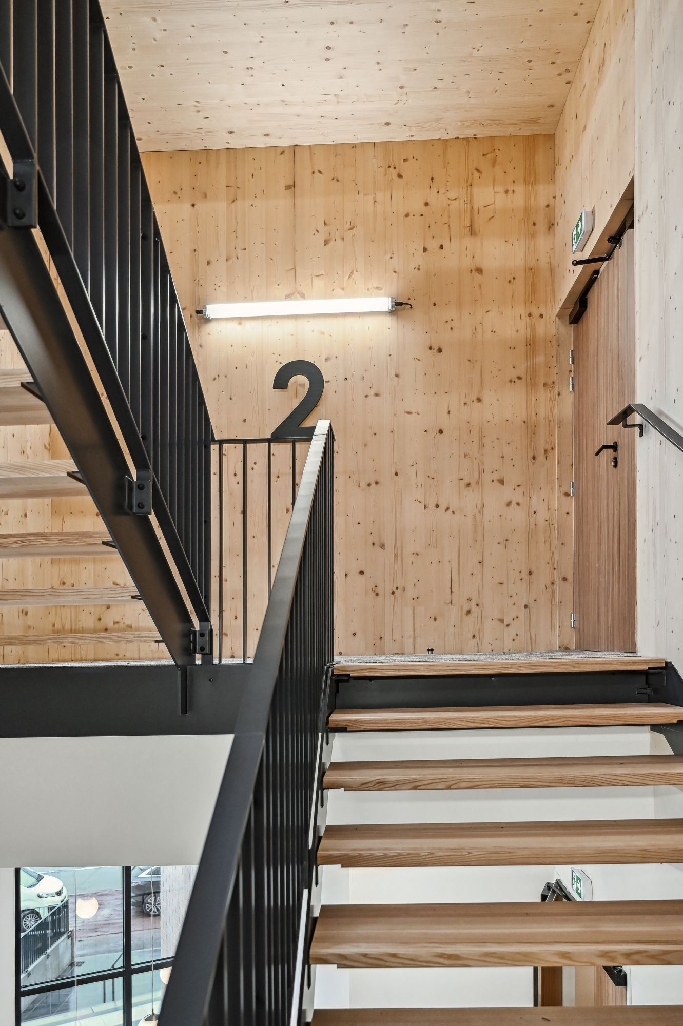 La volonté du client était d’avoir une cohérence entre le bâtiment d'origine en béton et la surélévation en bois en alternant les matériaux, tout en intégrant dans le concept décoratif des coloris sobres et intemporels.