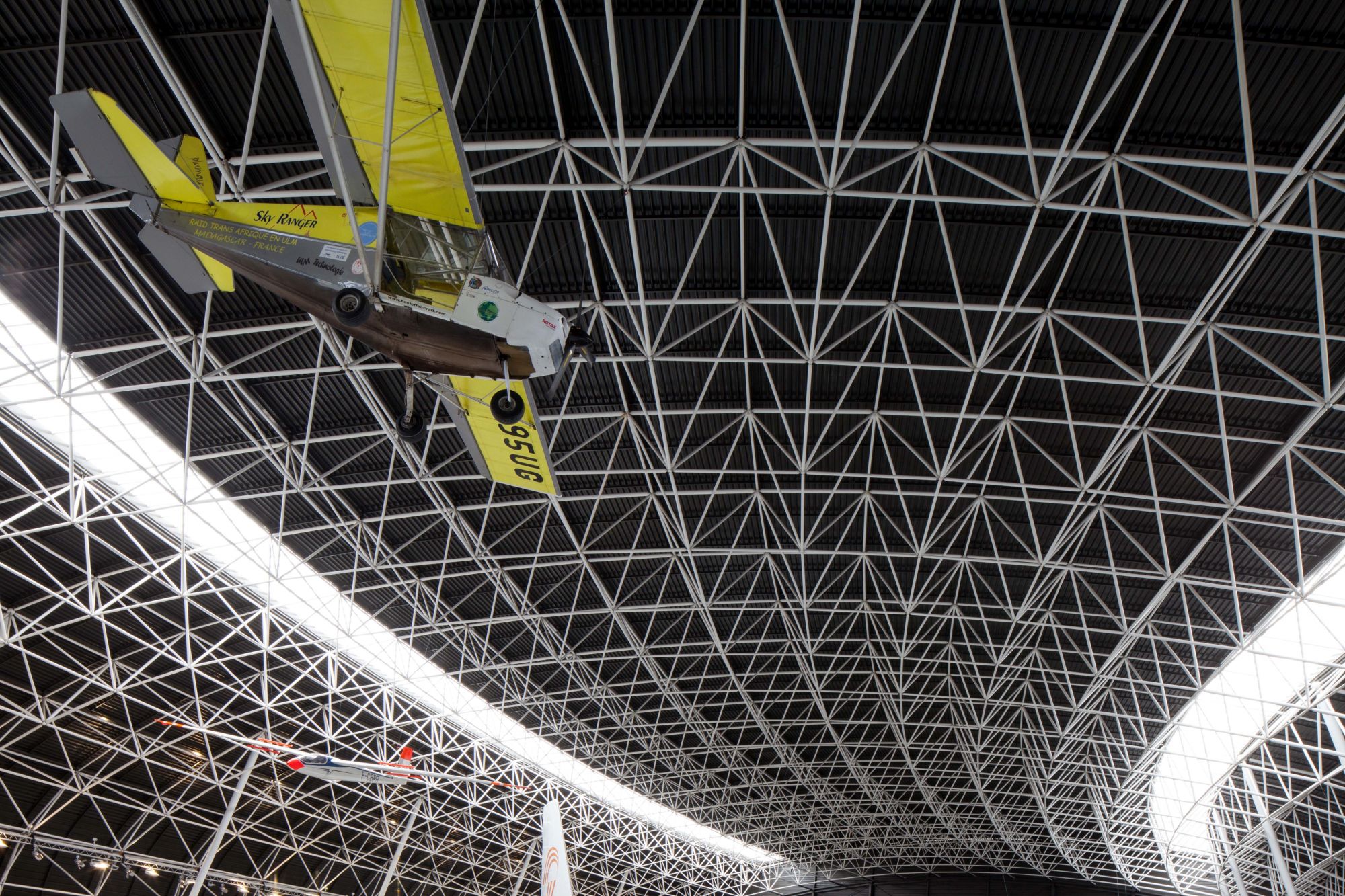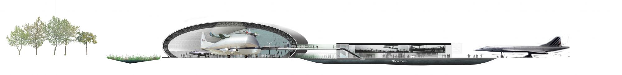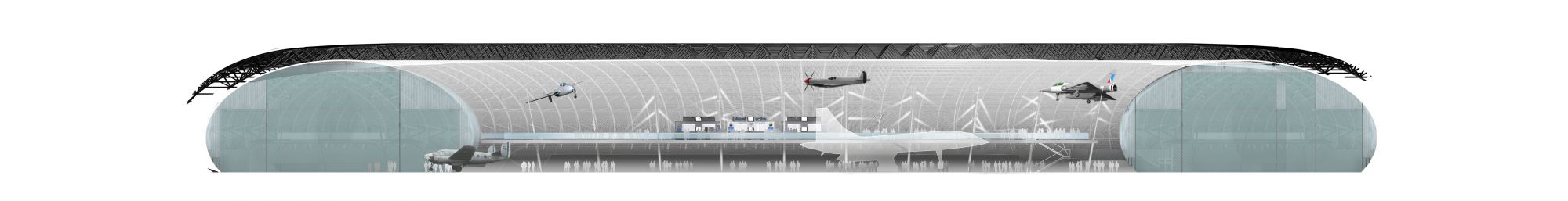 A quelques mètres de l’aéroport, face au site de l’A380, un musée, lieu de mémoire, support de vocations, abrite une collection exceptionnelle d’appareils. Plus qu’une forme courbe, c’est aussi une image iconique du hangar : un volume ample, total, sans murs ni couverture, mais une enveloppe unitaire, sombre, d’une évidente simplicité. ​