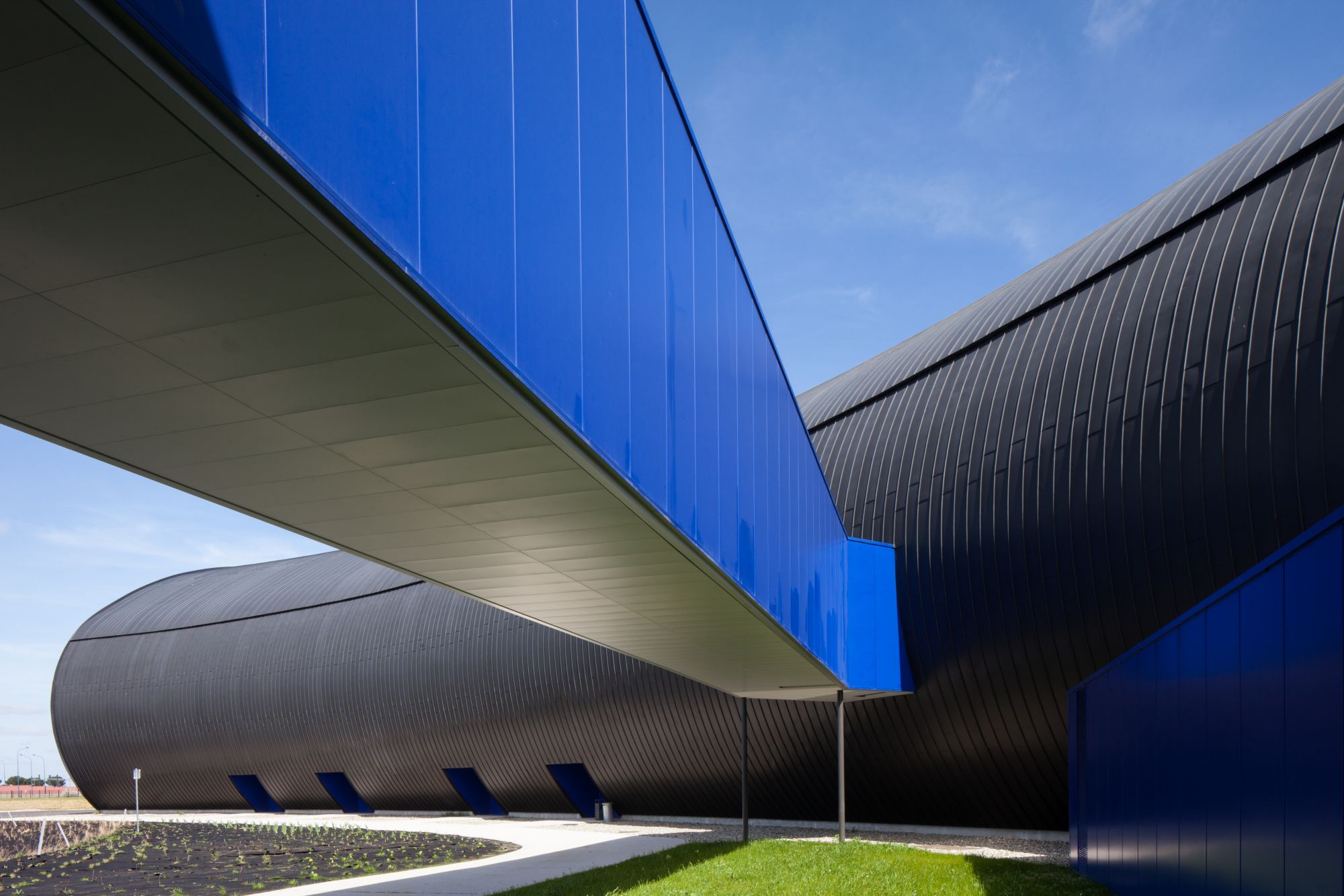 À la rectitude de l’usine d’Airbus, Kardham Architecture installe un dialogue subtil en répondant par une volumétrie toute en courbes d’un espace muséographique évoquant un fuselage d’aéronef.