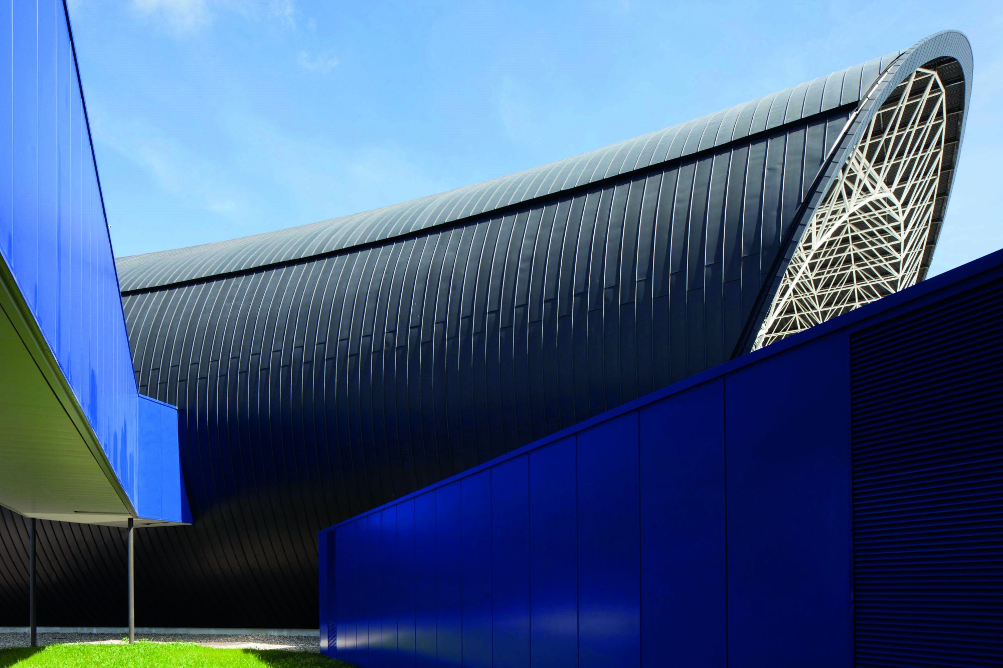 Arrimé au sol et assemblé comme un meccano géant, vêtu d’une peau d’acier noir finement incisée, ce bâtiment est inattendu mais en tous points contrôlé.